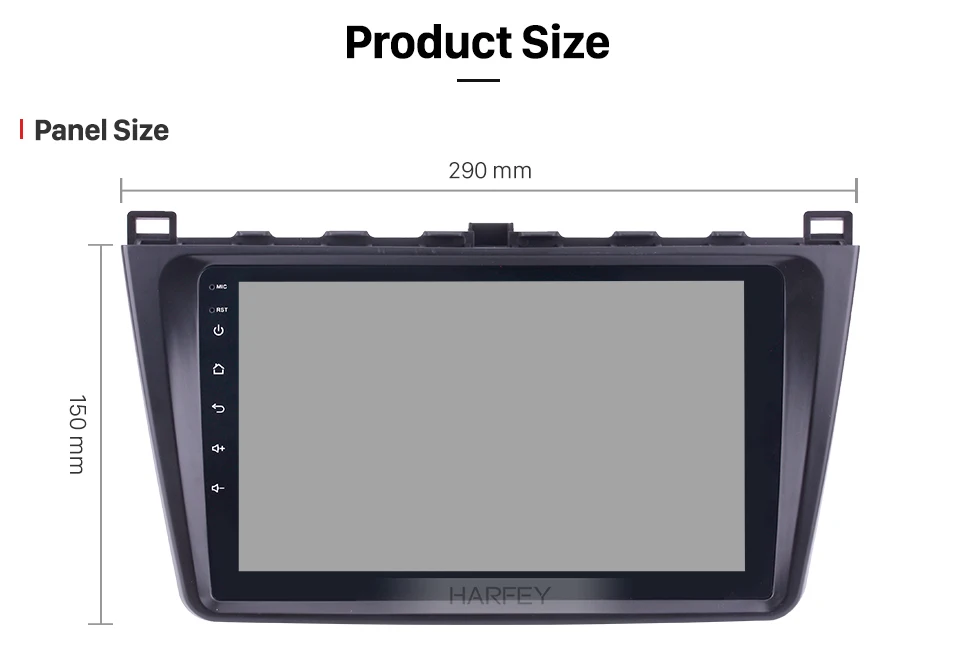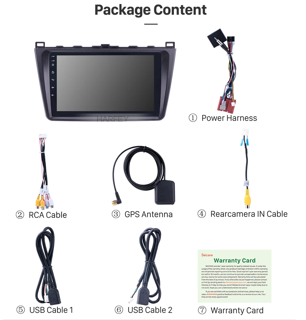 Harfey 9" 2 Din Android 7.1/8.1Head Unit WiFi Car Radio Stereo GPS Tochscreen Multimedia Player For 2008 2009 2010 2011 2012 2013 2014 2015 Mazda 6 Rui wing Overview 3G&WiFi/App download/3D Navigation/Radio Tuner/Bluetooth/Dual Zone/ File Management/HD 1080P Video/Steering Wheel Control/Mirror Link/OBD2/DVR/Backup camera/MP3/AUX/USB/SD etc. Configuration OS: Intelligent pureandroid 8.1/android 7.1 operation system. CPU: High quality Quad-core 1.6GHz T3 K2001M processor with great performance GPU: with Mali-600MP4 Quad-core GPU, It supports dual-screen display for the highest resolution of 2048*1536. Hard Disk:16 GB INand Flash RAM:1GB Samsung DDR3 Screen:1024*600 multi-touch screenwith smooth operation, high sensitivity and abundant interaction for the better view of your road ahead. UI: With exquisite and user-friendly user interface, you can set any of your favorite application icons as shortcut on the main menu and set the position of the icons according to your preference. Please Note:1. This unit can't support your car's orginal AUX port2. If your car speaker has BOSE sound system, you need to order an adapter additional3.This unit can't support handsfree button on the steering wheel Please Note :Android 7.1 CPU ISQuad-core,Android 8.1 CPU IS 8-Core Features High Speed 3G&WiFi Internet:The system supports surfing internet via 3G or WiFi. It comes with WiFi module. You can perform Google search on the road with quick search box, play online games, watch videos, download online data and check emails by connecting to any WiFi hotspot in range or 3g internet. App download:It replaces your factory radio with android based system of great utility and extendibility. You can download any applications in the android market for access to games, Skype, MSN, YouTube, twitter, E-Book, Gmail etc. This system also supports installation or removal of apps on RAM or SD optionally. 3D Navigation:The car stereo is equipped with worldwide real-time navigation function of high accuracy. With current location, speed, mileage, landmark building display, 3D street view, destination search and turn-by-turn voice directions, it will be your perfect road companion. With dual zone function, the music from radio/AV/DVD/TV etc can be played behind the scene under GPS mode and it will switch to the GPS voice automatically. Radio Tuner:Built-in with strong digital FM/AM radio tuner, this car A/V system features searching radio channels automatically, manually and storing them in the process. RDS is also supported. Bluetooth:It upgrades your car with BC8 Bluetooth module for hands-free calls and music streaming. With ringtones and voice coming out from the car speakers, you can dial, answer, reject and mute calls without taking your hands off the steering wheel. Its phonebook function enables you to search for contacts directly on the big screen of the head unit. The capability to stream your favorite tunes from the Smartphone wirelessly is also desirable. An internal microphone is included for distortion-free talking. Office Tools:You can read and edit office files such as WORD/EXCEL/POWERPOINT/PDF/TXT on it as your tablet. File Management:With file browser, you can open files with the corresponding applications, search files and manage them. HD 1080P video:HD 1080P video playback is supported by this car DVD player. AUX:This function is for audio, video input and output from external devices. Steering wheel control:Your original car’s steering wheel controls will still work after installation. 32GB USB/SD Connection:with USB and SD slots of 32GB capacity, this unit allows for audio and video play, photo view, E-book Reading etc from SD or USB. MP3、WMA、AAC、RM、LFAC audio formarts,MPEG-1/2/4、H264、H263、VC1、RV、RMVB、DivX、Sorenson SparK、Spark、VP8、AVS Stream video and JPG/BMP/JEPG/GIF/PNG picture are supported. IPod/IPhone Charging:This multimedia supports charging your iPod/iPhone via the USB cable. OSD Languages:37 kinds of OSD languages are supported including: Chinese Traditional, Chinese Simplified, Japanese ,Korean ,Arabic ,English (Australia),English (Canada) ,English (new Zealand),English (Singapore),English (United kingdom),English (United States) ,Afrikaans, Bahasa Indonesia ,Bahase Melayu ,Deutsch(Deutschland), Deutsch(Liechtenstein), Deutsch(schweiz), Filipino, Fancais(Belgique), Fancais(Canada), Fancais(France),Fancais(Suisse),Italiano(Italia), Italiano(Svizzera), Kiswahili, Latviesu, Magyar,Nederlands, Norsk bokmal,Polski, Portugues(Brasil), Portugues(portugal), Rumantsch, SlovenCina,Suomi, Svenska ,Pyccknn. Designable Elements:8 live wallpapers and 21 wallpapers are preset. You can set any picture you like as wallpaper. You are also enabled to DIY startup picture and main menu. Built-in Amplifier:4 channel output 4*45W Amplifier is embedded into this car audio system. Mirror link:It synchronizes your mobile phone trough WiFi or USB. This technology enables you to gain access to your Smartphone’s applications on the unit to play music and videos etc. It currently supports iPhone, Samsung Galaxy (android 4.2 and above). Options DVD player:With this one din DVD player, you can play CD and DVD discs. With anti-shock and last position memory technology applied, you can watch movie or video in motion. Formats such as DVD/DIVX/MP4/MP3/MP2/VCD are compatible. HD Digital TV:DVB-T/ATSC/ISDB-T HD TV Tuner can be provided for receiving digital TV channels. Car DVR:The DVR function is used for recording the whole process of traffic accidents, taking photos for front of vehicles and storing the video in real-time while driving. 3G module:With this 3g module, you can connect to 3g internet by inserting an SIM card to it. Backup Camera:It adds a backup camera for automatically switching to the parking image while reversing. This option includes a waterproof and night vision backup camera which will be mounted to the position of your car’s license plate lights and the cables for its connec